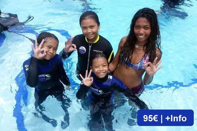 So spaßig, wie es klingt – die Gelegenheit für Kinder, Blasen zu machen! Ab 8 Jahren können die Kinder mit Tauchausrüstung unter Wasser atmen und in flachem Wasser schwimmen. Veranstalte eine Party oder feiere einen Geburtstag, indem du ein unvergessliches und spannendes Bubblemaker-Erlebnis mit Freunden und Familie organisierst.